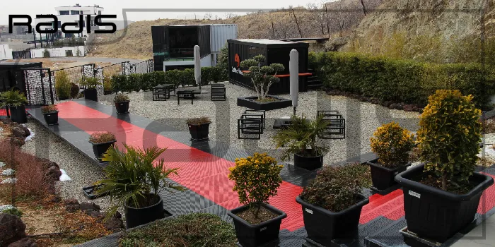 تایلهای کف پلی اورتان برای جا دادن سرسره و تاب و وسایل بازی، زمین بازی شنی، زمین بازی والیبال، زمین چمن تنیس، استخر کم عمق، فضایی مختص پرورش پرندگان اهلی کوچک و…که فضای باغ را نیز زیباتر میسازند.